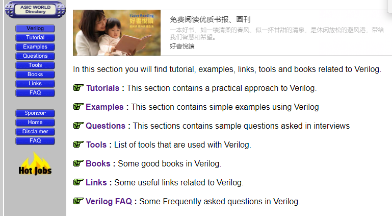 这是一个为ASIC/DIGITAL /FGPA学习者量身打造的网站,在这里你可以学到很多种语言,内容非常丰富。光是学习Verilog,就包括了教程、示例、疑问、工具、推荐书籍、链接和常见问题等部分。