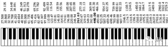 音调程序里面包含21个常用的电子琴音调,分别分为3个层次,低音、中音和高音,以适应不同场合的调用要求[3]。电子琴的音符频率是根据特定的音阶和调式确定的。例如,C大调的音符频率为:C4(261Hz)、D4(294Hz)、E4(330Hz)、F4(349Hz)、G4(392Hz)、A4(440Hz)、B4(494Hz)等。而在给出音调索引之前,还需了解电子琴音阶与频率之间的关系,如图3-3所示。