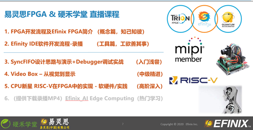 作为国内最具特色FPGA厂商,易灵思在2020年4月携手硬禾学堂https://class.eetree.cn/专业的电子行业教育平台,给同学们带来了6节精心准备的”FPGA特种兵实战教程”,从易灵思的创新架构讲起,到规范高效的FPGA开发流程,再到逐步深入的典型应用案例:如Video Box平台演示,RISC-V四种内核在FPGA中的实现,给大家讲述了FPGA开发方法和技巧。截止目前已经有1000+人次观看,如果有需要大家可以随时登陆硬禾学堂网站https://class.eetree.cn/detail/p_5e91440dcf7f8_ZguMupaJ/6,硬禾学堂公众号,或发送邮件至易灵思中国邮箱sales-cn@efinixinc.com获取相关资源。