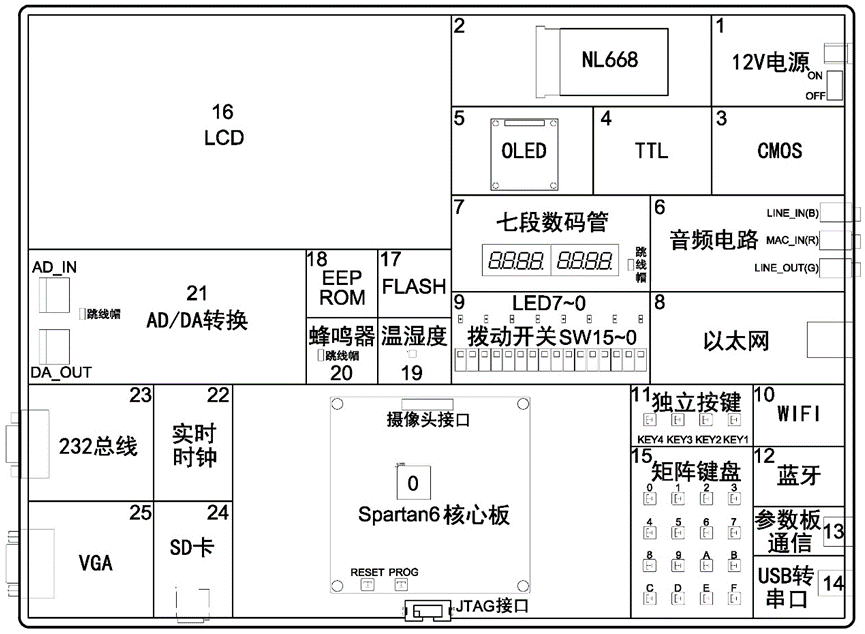 系统搭载的电路模块分区如上图所示,通过12V电源适配器供电,基于LED、拨动开关、独立按键、矩阵键盘、蜂鸣器、温湿度、七段数码管等基础模块可以开展简单实验,基于外拓SDRAM、OLED、音频、以太网、AD/DA转换、VGA和摄像头等高级模块可以开展复杂实验,还可以通过232总线、USB转串口、EEPROM、Flash、蓝牙和WIFI等开展基于232、串口、IIC、SPI等通信协议的实验。