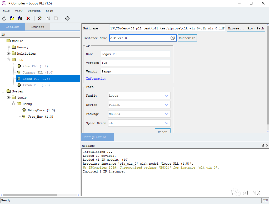 2. 再在弹出的界面里选择PLL下的Logos PLL,再对PLL取名clk_wiz_0,然后单击Customize。