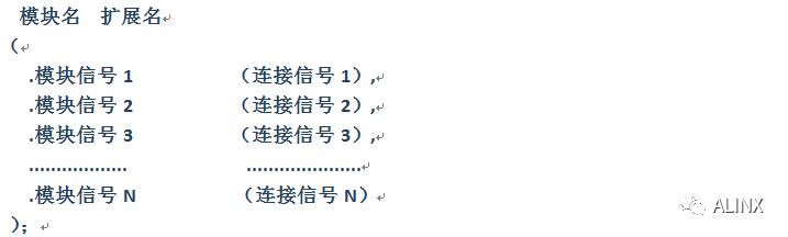 注意:例化的目的是在上一级模块中调用例化的模块完成代码功能,在Verilog里例化信号的格式如下:模块名必须和要例化的模块名一致,包括信号名也必须一致,模块与模块之间的连接信号不能相互冲突,否则会产生编译错误。