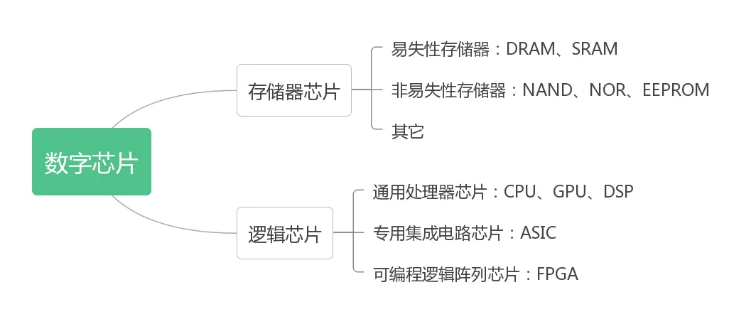集成电路芯片包括数字芯片和模拟芯片两大类,数字芯片可以分为存储器芯片和逻辑芯片,我们熟知的逻辑芯片一般包括CPU、GPU、DSP等通用处理器芯片,以及专用集成电路芯片ASIC。FPGA(现场可编程门阵列,)也是逻辑芯片的一种。