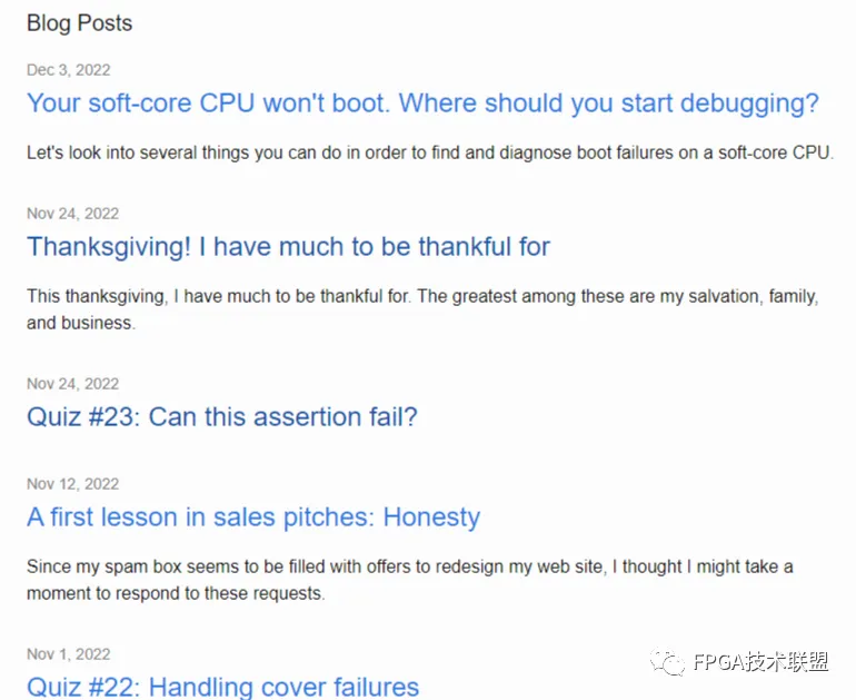 14、ZipCPU网站地址:http://zipcpu.com/ 一个国外的FPGA大佬的技术博客,一直在更新,主要是软核CPU和FPGA设计技巧相关内容。