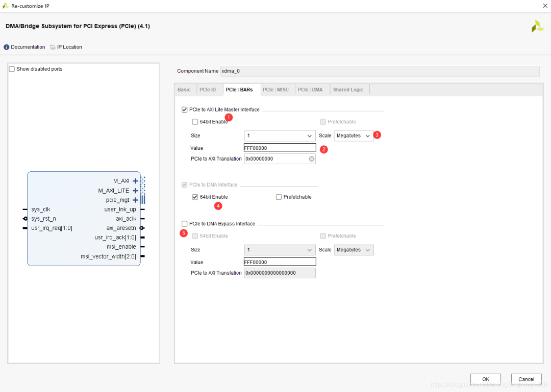 2、主机侧PCIE BAR 地址与用户逻辑侧地址是不一样的,这个设置就是进行BAR 地址到AXI 地址的转换,比如主机一侧 BAR 地址为0, IP 里面转换设置为 0x80000000,则主机访问 BAR 地址 0 转换到AXI LIte 总线地址就是0x80000000,这点的理解特别重要