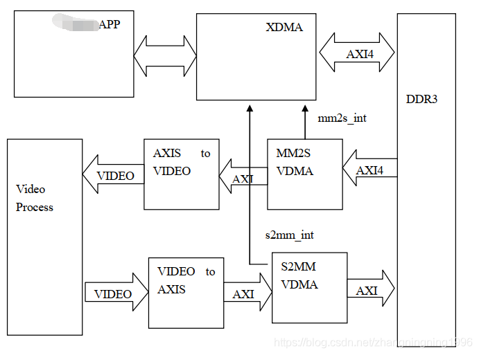 由上图可以看出,图像数据是由 PC 端产生,然后用过 XDMA 传输到 ZYNQ 的 DDR3(通过 HP 接口),数据再经过一个 MM2S 的 VDMA 从 ZYNQ 的 DDR(通过 HP 接口)读出到 AXIS 接口,经过 AXIS to VIDEO 转换到视频时序,可以做视频处理,之后再经过 VIDEO to AXIS 转换到 AXIS 接口,经过 MM2S 的 VDMA 存入 DDR, XDMA再从 DDR 将图像数据读出到底 PC。这里面实际上包含了两条传输路径,一条是 PCIE 到视频,一条是视频到 PCIE,一个工程,两个操作例子,很有参考意义。