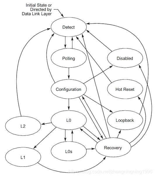 LTSSM状态机。LTSSM全称是Link Training and Status State Machine。这个状态机在PCIe总线的物理层之中。状态转移图如下: