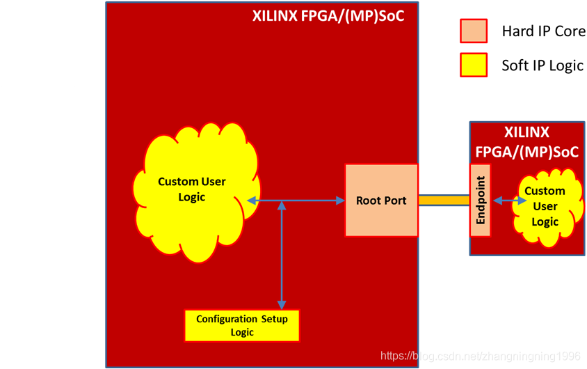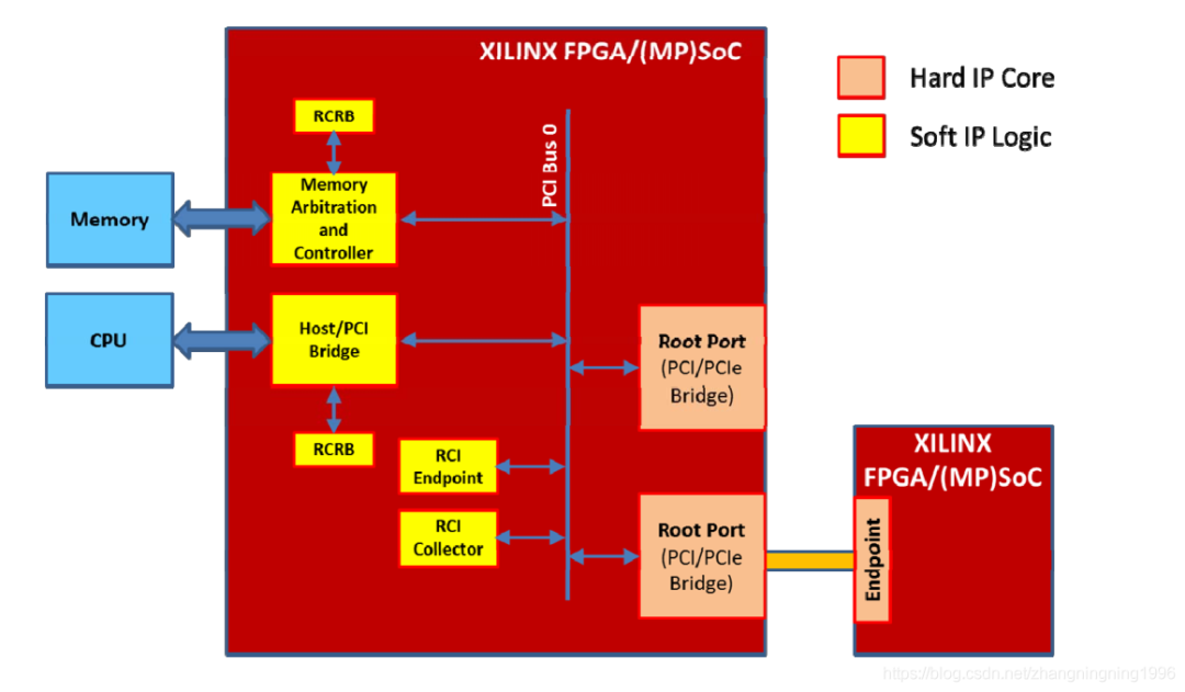 Xilinx FPGAs支持硬核root port,但是没有硬核root complex。root complex包括一个或多个root port、内存,IO子系统等等。root port只是提供给switch或者endpoint连接的端口。二者之间的关系如下: