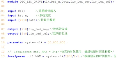 (4) 数码管驱动模块(文件名 DIG_LED_DRIVER.v)该模块为数码管驱动模块,负责将 ADC 显示控制模块传递过来的数据输出到数码管显示。