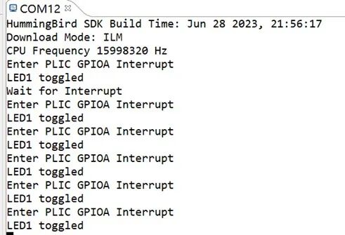 (2)外部中断。采用两个按键作为外部中断源,两个LED作为中断服务函数的控制对象,每当按键被按下,触发一次中断,处理器监听到中断后,进入服务函数,在这个函数中通过分支判断语句分辨是哪一个按键所发出的中断,并控制对应的LED灯切换亮/灭状态。运行程序可以在终端观察到图2所示的输出。