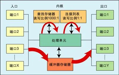 图1显示了典型的网络架构。在10Gbps,一个读写比为1000:1的地址查找可很容易地在DDR SRAM中得到处理。连接列表管理、流量修整、统计收集任务通常具有平衡的1:1读写比,需要较高性能的QDR SRAM。另一方面,较大的缓冲存储器一般在DDR SDRAM中实现。作为DRAM的替代,SDRAM同步存储器访问的处理器时钟用于快速数据传输。达到快速是因为SDRAM允许存储器的一个块被存取,而另一个块准备被存取。与DRAM不同,SDRAM采用流动电流而不是存储电荷,除去了连续刷新的需要。