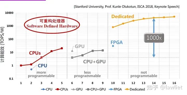 此外还有一个类型的处理器概念已经火了一段时间了,但是由于软件工具链的限制,一直没有得到很好的推广。那就是CGRA,它的目标是达到接近CPU的可编程性,同时接近专用ASIC的计算能效比。如下图所示。该处理器又有个另外的说法:软件定义硬件。其实现机制是通过软件调度不同的运算单元PE,来实现不同的运算。有点类似于FPGA,但是CGRA的粒度更粗,配置更快。关于CGRA的更多概念大家可以查阅相关资料。大家有兴趣的话我也可以单独写一篇文章进行介绍。