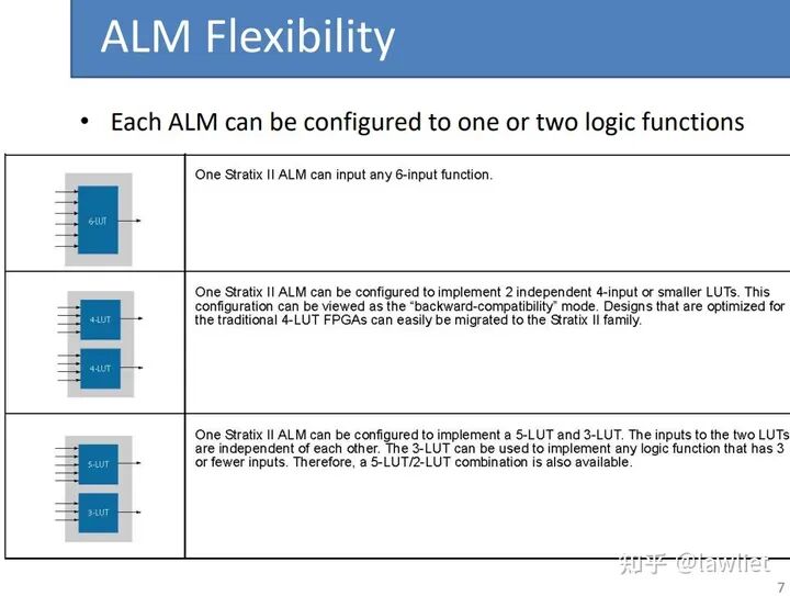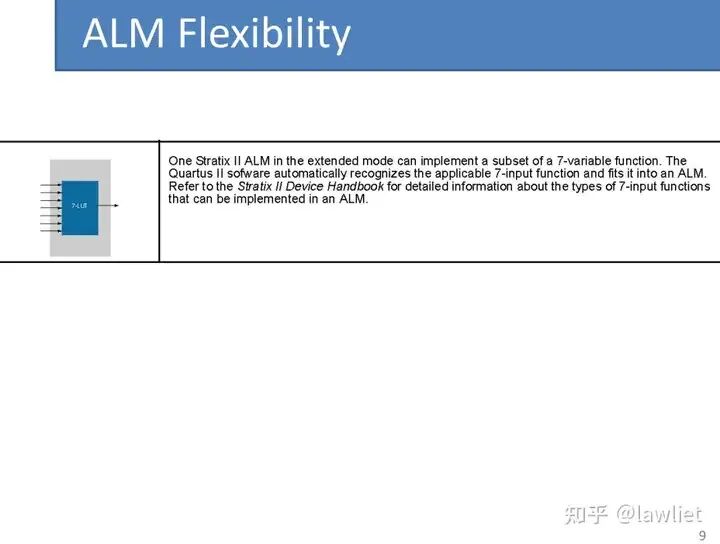 然后花了三页篇幅说明ALM的优势所在,ALM其实跟之前所说的LE类似,但更有优势。LE需要通过级联和反馈来生产输入多于可用输入的函数,加入ALM可以更好的解决这个问题。ALM包括2或4或其他个的输出寄存器,为生成函数提供了更多选择(增加了排列组合,因为输出寄存器变多了)。