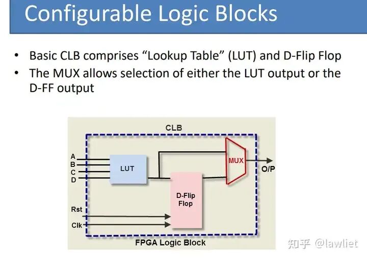 CLB的基本组成如上图所示。由查找表(Lookup Table,LUT)、D触发器和MUX组成。MUX可以决定是从LUT输出还是DFF输出。上图只是最简单的一个CLB图示,不同型号的FPGA的LUT内部组成略有区别,如查找表的数量、触发器的数量有所不同。但就本质而言,没有区别。大家掌握上图结构即可。