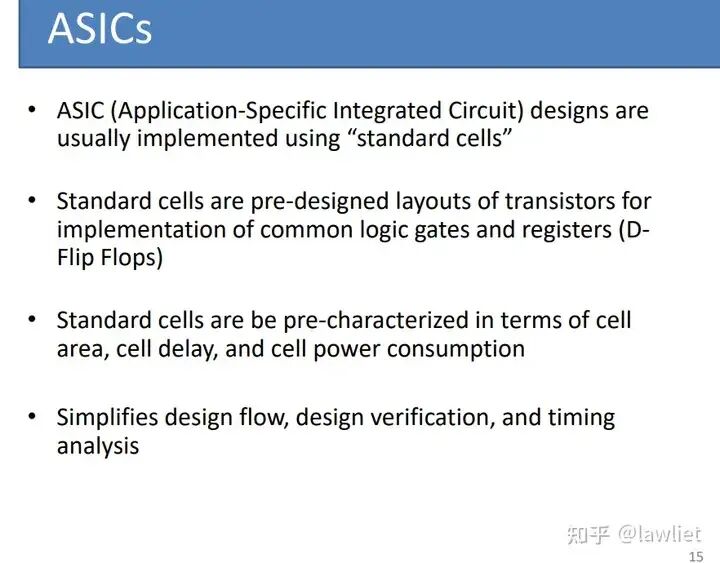 ASIC,全称应用专用集成电路。它通常是由“standard cells”设计而成的,也就是俗称的标准单元。标准单元是由Foundry如TSMC等厂商提供的。我们做DC综合的时候,需要将我们的代码映射成实际的电路,首先就需要先选择一款工艺库,这些工艺库的器件有详细的参数,基于此我们的设计在流片之前就可以大致分析面积、功耗、时序等等。方便了我们的设计,也为设计结果提供了预期。