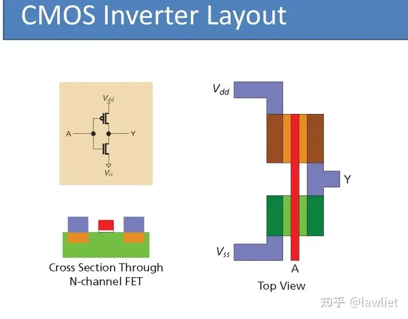上图所示是基于CMOS工艺实现的反相器,A给高电平,则Y和地相连,输出电平为0。实现了取反逻辑。下面和右边这个图有个印象即可,不用具体掌握。