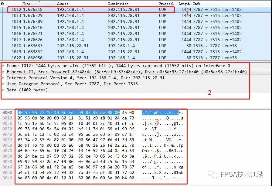 上面介绍了那么多接口以及以太网的相关知识,那么问题来了,如何去快速学习千兆以太网呢?个人认为掌握好总体框架以及接口细节,理解UDP协议,掌握抓包等等,慢慢琢磨学习,大家都可以慢慢掌握好的。那么下面咱们就来聊聊千兆以太网的UDP协议,并且会结合wireshark抓包软件抓取到的以太网包,带着大家看一下以太网的协议到底是怎么样的呢?当然,像我们常用的以太网协议有TCP/IP,UDPTCP/IP和UDP相比,TCP/IP是一种数据可靠的协议,而UDP是一种数据不可靠的协议。至于为什么TCP/IP是可靠的,而UDP是不可靠,留给大家自行百度。在wireshark中可以抓取到经过网口传输的很多数据包,可以说只要是经过网口的数据,在wireshark中都能抓到。