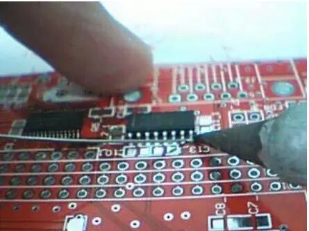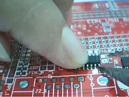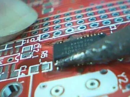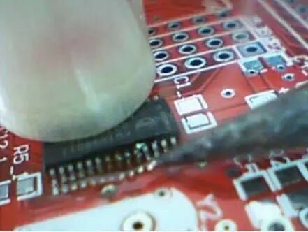 以上介绍的是密引脚IC的焊接方法,但是不要把这种焊接方法用到所有的贴片IC上,上面那种焊接法感觉是引脚越密越好用,基本上引脚间距小于等于0.5mm 的片子才这么焊,具体操作就看感觉了。下面就来看看引脚间距稍大一些的 IC 怎么焊接,以 USB 板上的 MAX232 为例。