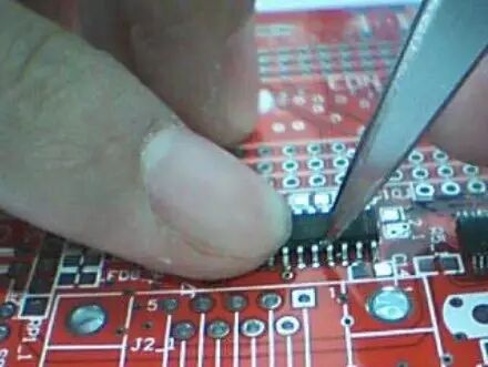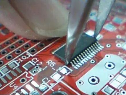 然后用镊子把芯片对准焊盘,这时候焊盘上有锡的那个引脚就被顶起来一点儿了,找好感觉,把芯片对上去。