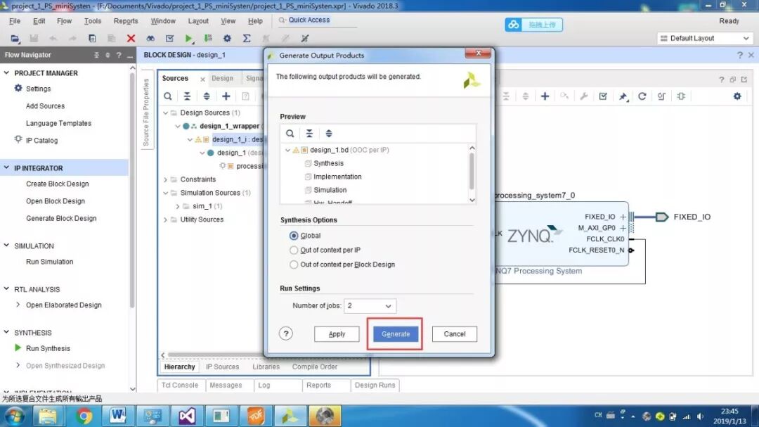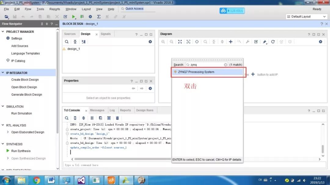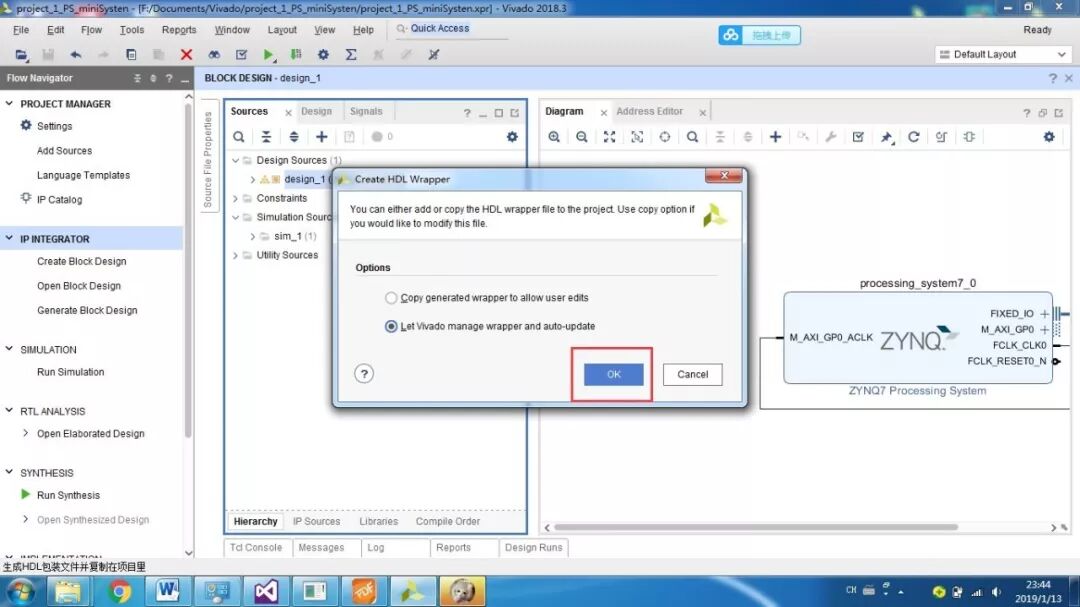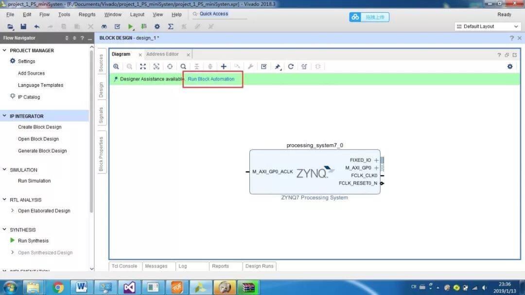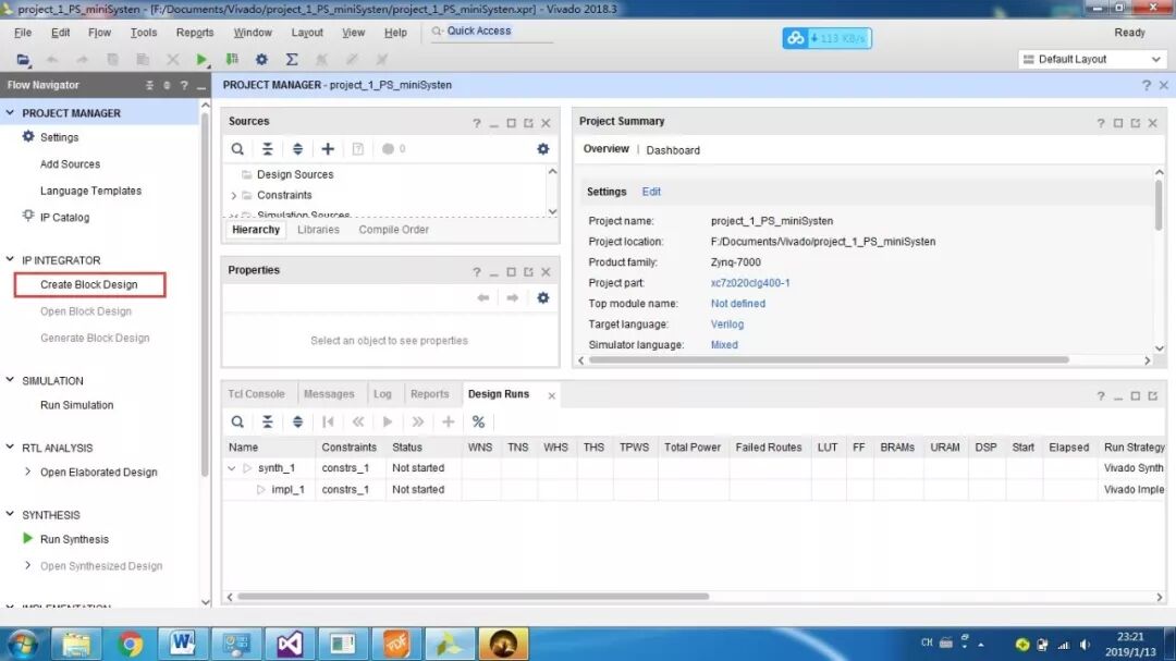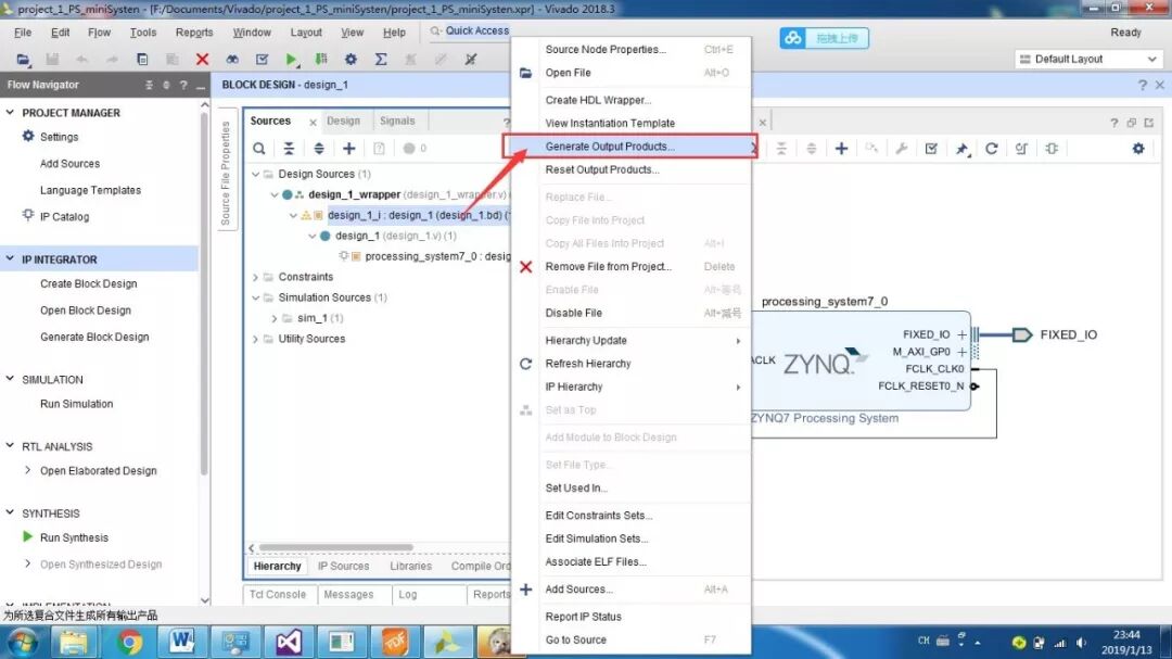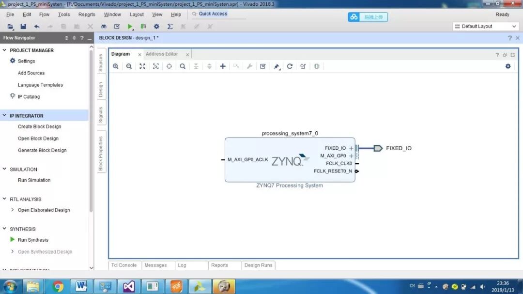 PS即为Processor System,为Zynq 7000中内嵌的ARM-A9硬核,为了测试系统是否运行,我们加入串口打印hello world。首先还是新建一个工程,然后添加文件,设计,综合,实现,生成。