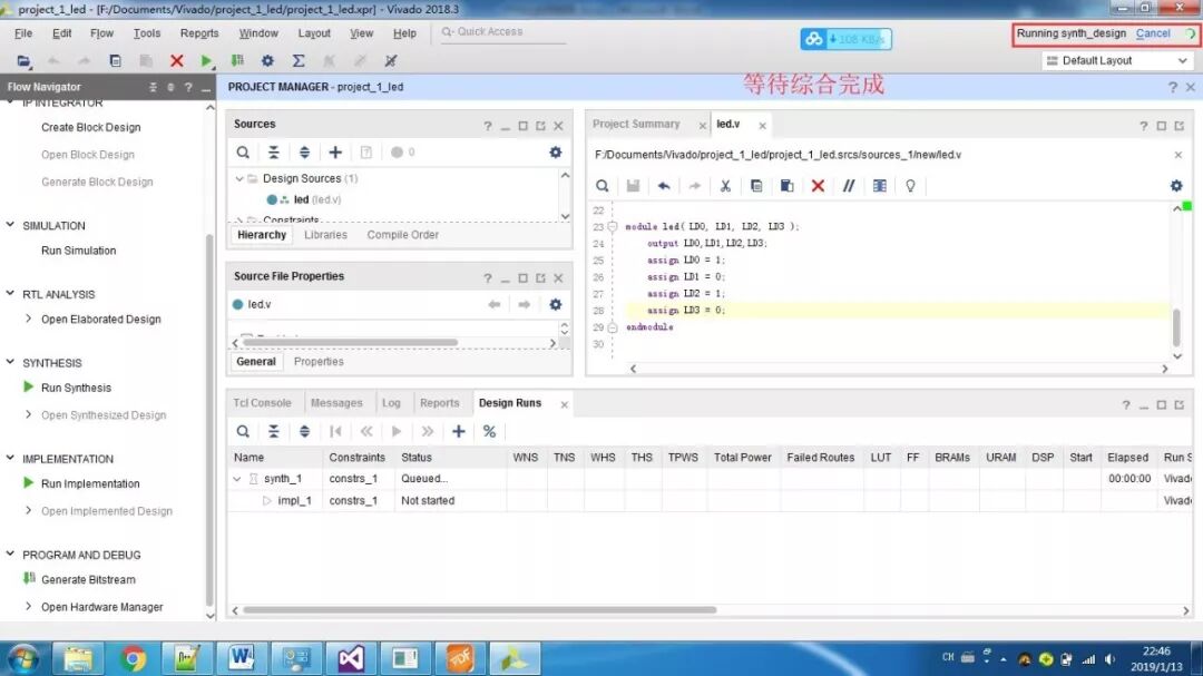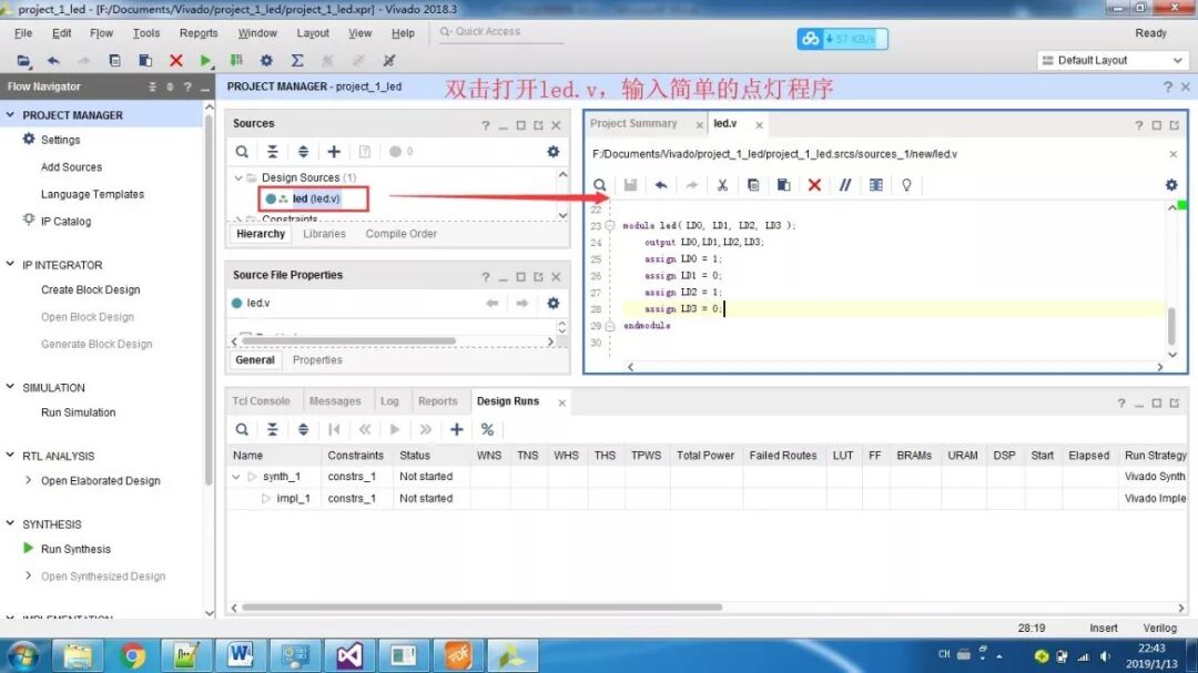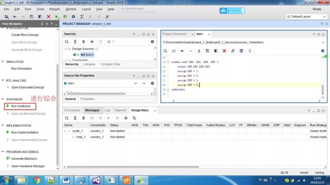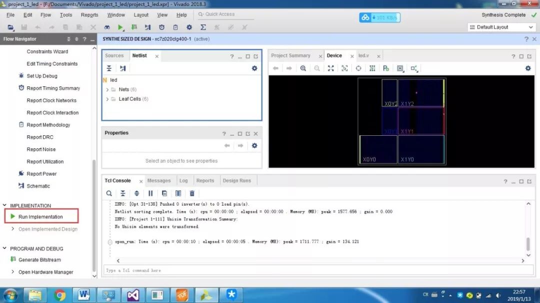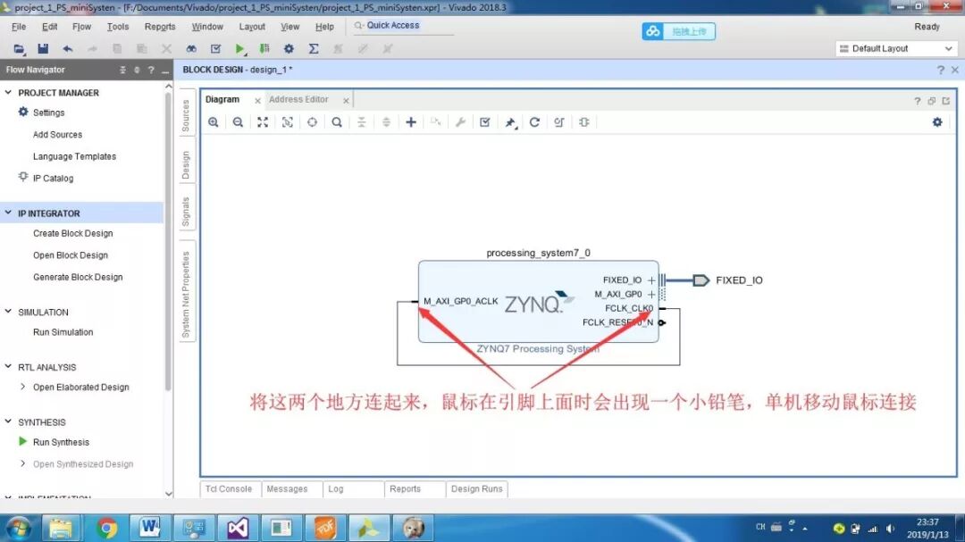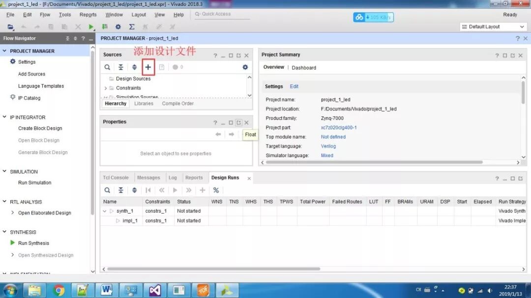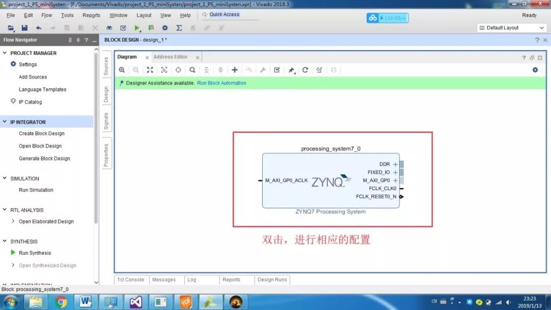 PS即为Processor System,为Zynq 7000中内嵌的ARM-A9硬核,为了测试系统是否运行,我们加入串口打印hello world。首先还是新建一个工程,然后添加文件,设计,综合,实现,生成。