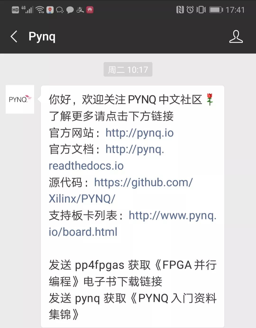 PYNQ唯一社区官方微信,有最新消息的发布和项目分享交流,微信扫一扫即可关注,还可获取PYNQ入门资料集锦。