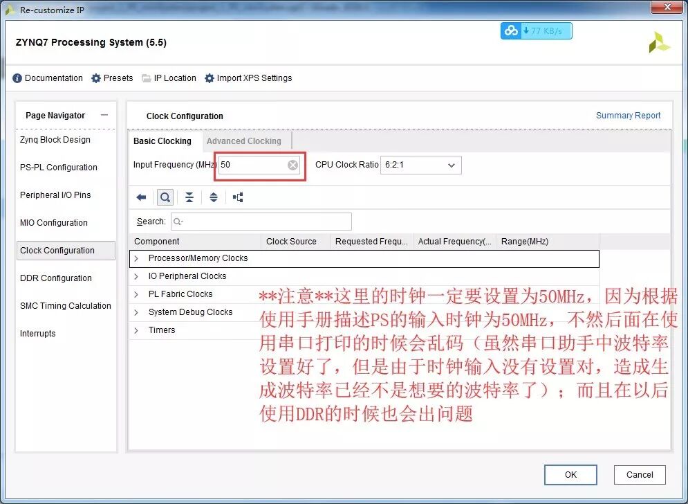设置时钟,这里是一个非常关键的注意点,板卡上的晶振是50MHz。