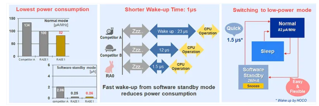 RA0E1在运行和软件待机模式下提供更低的功耗。运行NOP指令时,正常工作模式的功耗低至84.3μA/MHZ,这意味着CPU可以在活动模式下以非常低的功耗空闲等待中断。即使是完全激活的运行模式,也可以通过调低CPU时钟速度来提供多种低功耗选项。软件待机模式可以停用MCU的片上功能,将功耗降低到尽可能低的水平。RA0E1的典型软件待机电流为200nA。此外,RA0E1从待机模式唤醒时间为1.6μs,比竞争产品快 7 倍以上。这样可以最大限度地减少电池供电应用间歇运行期间的电力浪费,从而最大限度地延长应用的正常运行时间。