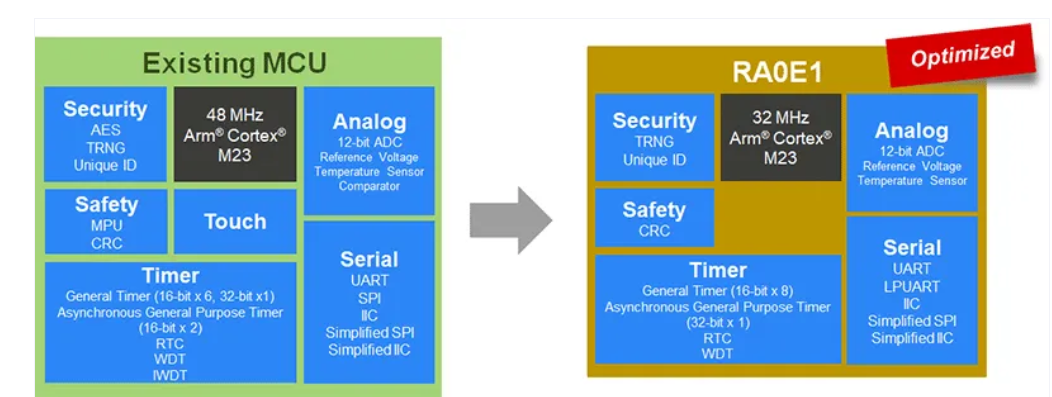 超低功耗RA0E1实现了针对入门MCU市场降低BOM成本和易于设计的优化外设。借助这新款MCU,可以让您简化设计,比以往更快地进入市场。