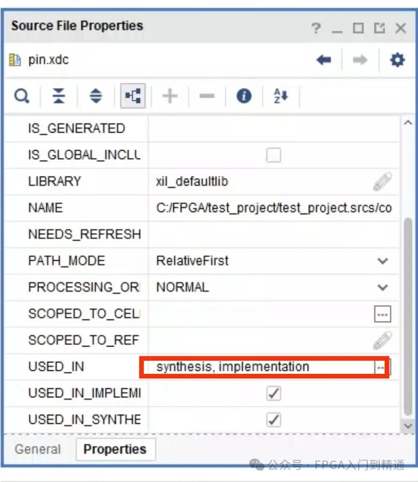 通过属性窗口【USED IN】,控制文件在不同阶段是否生效,上图中的属性窗口中{synthesis, implementation},表示这个约束文件在综合和实现阶段均有效。