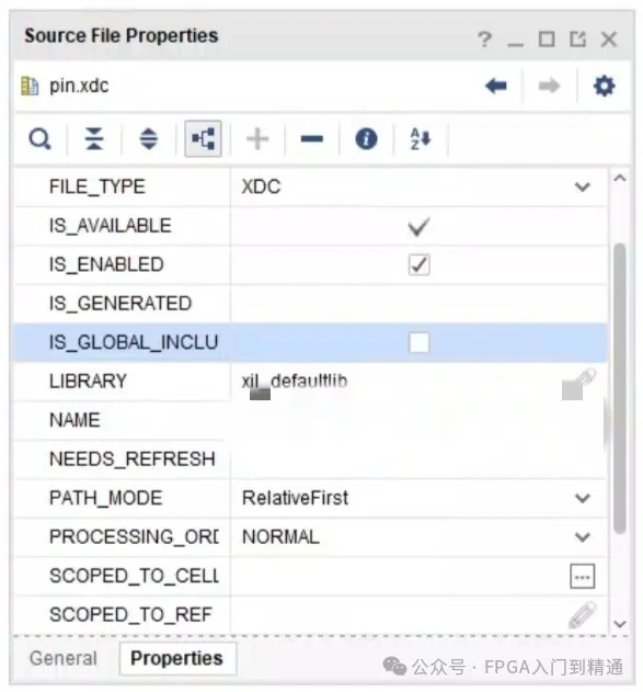 约束文件可以在属性窗口中查看,也可以通过Tcl脚本在Vivado Tcl Console中查看,TCL命令如下: