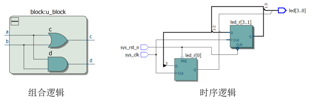 使用quartusii软件编写出上图左边的硬件描述代码,通过软件编译,就能生成最右边组合逻辑电路图来。每个Verilog程序包括4个主要的部分: