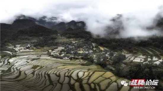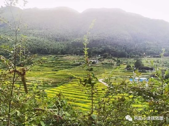 天色暗了下来,山色如黛。近处的稻田依然不改颜色,远处有几株百年的红豆沙,迎风挺立。溪水流动的声响,从山间传来,夹带着些许雾气。走进雾中,方知梯田一侧有一条悠远莫测的峡谷,从遥远的舜皇山麓延伸而来,静悄悄地掩藏在群峰之中。哗哗哗溪水的奔流声中,从树梢里传出,给这一片梯田增添了无限的生机。
