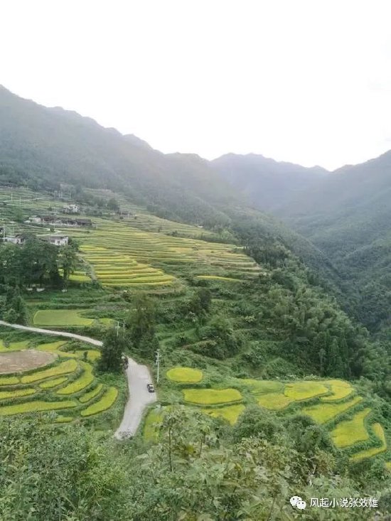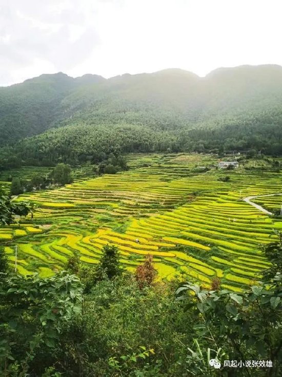 登上这一大片梯田东面的山坡,金黄色扑面而来。群山峡谷吹来的山风,将一千多亩稻子的清香,静静地灌进了我的心扉。