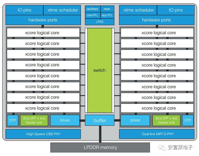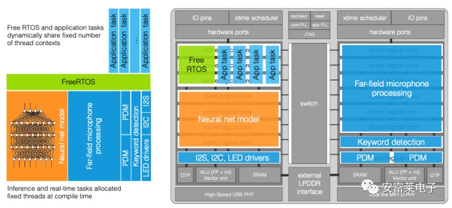 2、特色:(1)每秒380亿次累加乘。(2)每秒一百万次512点FFT。(3)128个纳秒级GPIO,并且可以像FPGA一样灵活定制各种IO接口功能,如SPI, QSPI, MII, I2S, I2C等。(4)片上1MB TCM RAM,带LPDDR接口。(5)片上USB高速PHY,带MIPI接口用于摄像头。(6)16个实时逻辑核心,支持标量/浮点/矢量指令,可根据应用实现灵活性和可扩展性。(7)用于数字信号处理,机器学习和密码功能的高性能指令集。3、软件 全部采用C编程,使用行业标准的LLVM/Clang编译,AI使用Tensorflow lite,固件可以采用FreeRTOS,并提供大量常用库。4、架构 xcore的开发旨在提供类似于FPGA的IO灵活性,并为嵌入式软件工程师提供关键的控制处理,使他们能够创建差异化产品,而不是重复参考设计。(1)2005年时,发布第1代xcore架构。第一代架构的成功为各种应用程序到IO协议之间架起桥梁,此设计获得数百项设计大奖,典型应用如USB Audio Class 2解决方案和S/PDIF接口 ,所有这些都可以软件实现(2)第二代xcore加强了控制和DSP性能,使其应用到各种客户解决方案中,以及为XMOS提供了一个平台,使其成为远场语音最杰出的供应商之一。(3)第三代是通用目的的跨界处理器,集单片机,AI,FPGA,DSP于一身。 xcore体系结构是可伸缩的,单独一个图块是1MB内存,380亿次累加乘速度,两个图块就可以实现2MB内存,760亿次累加乘。图块里面每个logical core都可以作为独立的硬件线程,可以独立运行AI,DSP和IO控制。