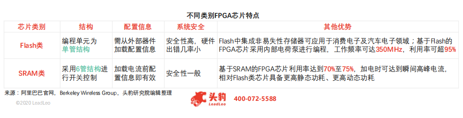 FPGA厂商主要提供基于两种技术类型的FPGA芯片:Flash技术类、SRAM技术类(Static Random-access Memory,静态随机存取存储器)。两类技术均可实现系统层面编程功能,具备较高计算性能,系统门阵列密度均可超过1兆。