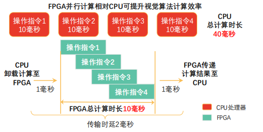 CPU为通用型器件,FPGA架构相对CPU架构偏重计算效率,依托FPGA并行计算处理视觉算法可大幅提升计算速率,降低时延。