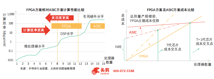 • ASIC设计过程涉及固定成本,设计过程造成材料浪费较少,相对FPGA重复成本较低,非重复成本较高(平均超百万美元)。