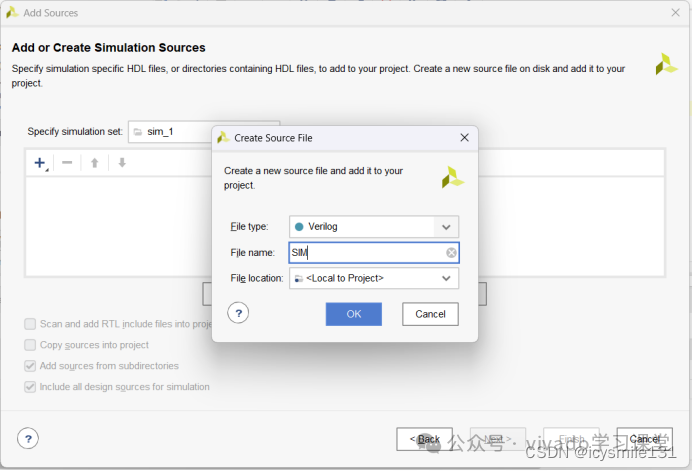 点击Design Sources中的“+”创建仿真文件SIM.v