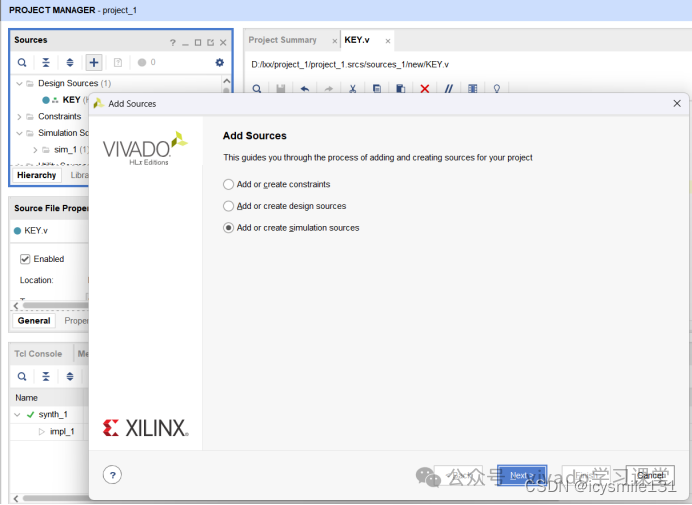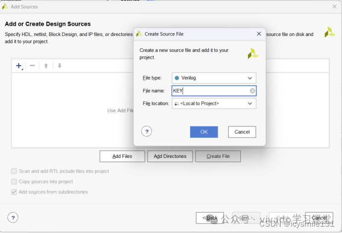 点击Design Sources中的“+”新建一个代码文件KEY.v。