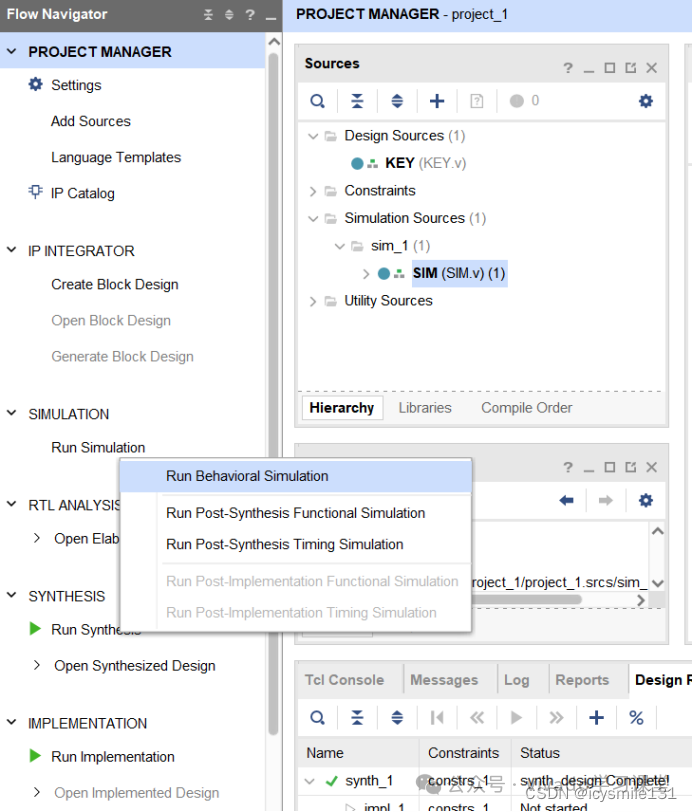 SIM.v文件创建完成后,可以看到Design Sources文件夹中有SIM.v文件,打开该文件编辑代码。