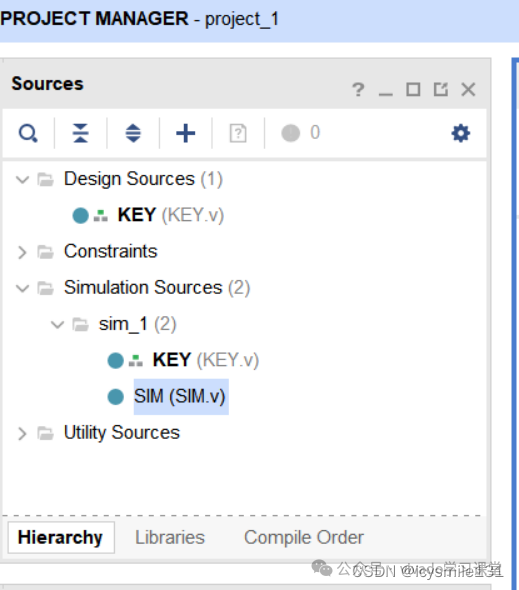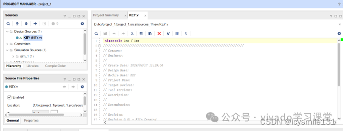 KEY.v文件创建完成后,可以看到Design Sources文件夹中有KEY.v文件,打开该文件编辑内容。