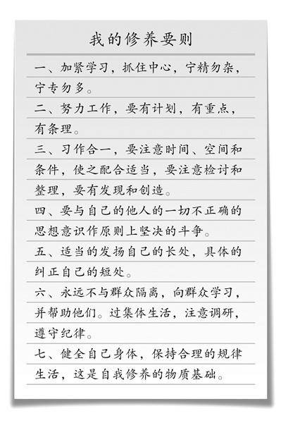 这天刚好是周恩来农历四十五岁生日。散会后,周恩来回到办公室,谢绝同志们为他祝寿,他反复回顾自己留学日本、法国和确立共产主义信仰以来的经历,为了随时警醒自己,他慎重地写下《我的修养要则》,共七条,以明心志。