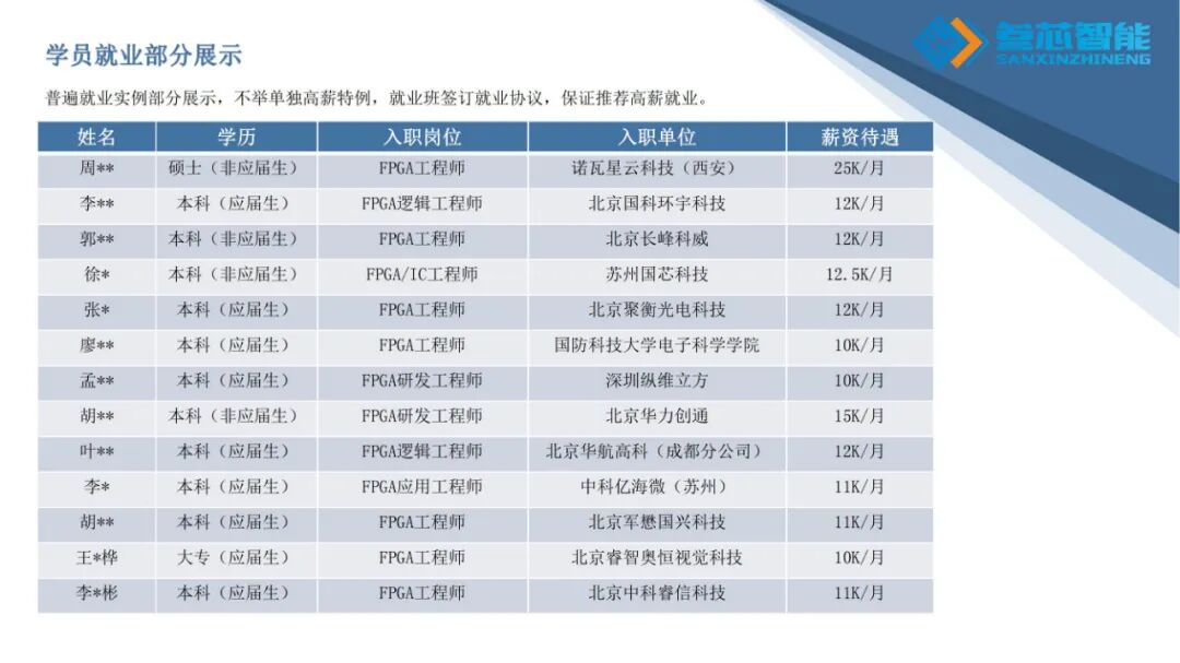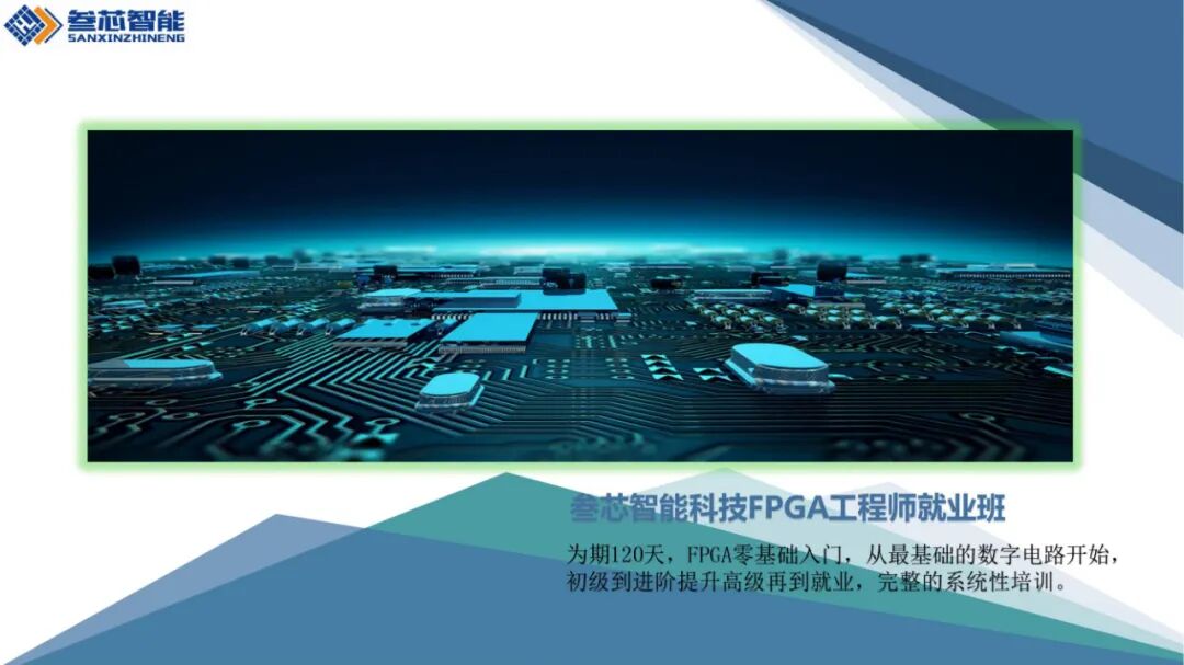 叁芯智能科技,推出FPGA就业班系列,系统性学习,高性价比选择,实打实学技术,教授学习方法,学习设计思想设计原理,分享学习以及开发经验,实战项目,理论的初步理解,从实践中结合理论,更好的深入理解,学技术,技术硬实力过关,普通高校普通的你也可以有一份不错的工作,如果你是名校,那就更好了,上班充电、行业内转岗学习深造等,各种类型技术培训,应有尽有,就业班签订就业协议,上百家合作单位,推荐就业,有保障,高新技术高薪就业!