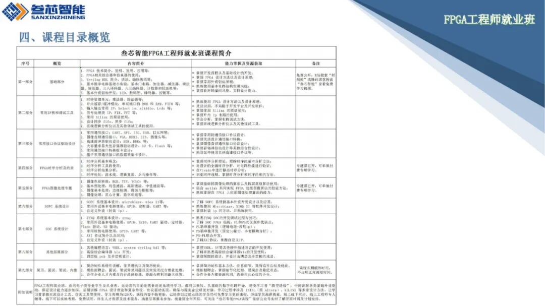 叁芯智能科技打造“FPGA 设计与研发”就业班系列, 可以让你从“小白”到“入门”再到“精通”。FPGA零基础入门,数字电路基础开始,初级到进阶提升,设计思想及设计方法深入理解,举一反三,Intel Quartus 、Xilinx Vivado、ISE等各类实操工具,动手实操,项目实战,讲解各类基础外设驱动,保证设计能力逐步加深;后期讲解 FPGA 设计理论和复杂外设、协议驱动实现,确保与现实企业研发对接。兴趣培养,简历指导,职业规划,推荐就业等,为你量身定制职业发展方案。
