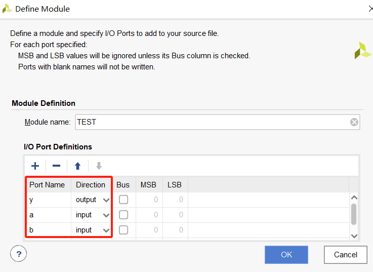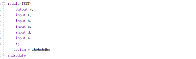 在上述创建了源文件的过程中,默认配置了一个输出端口y,5个输入端口a,b,c,d,e.module TEST( output y, input a, input b, input c, input d, input e );endmodule现在在代码上增加功能代码,实现输出是输入的与,y=a&b&c&d&e,使用赋值变量assign实现,如下: