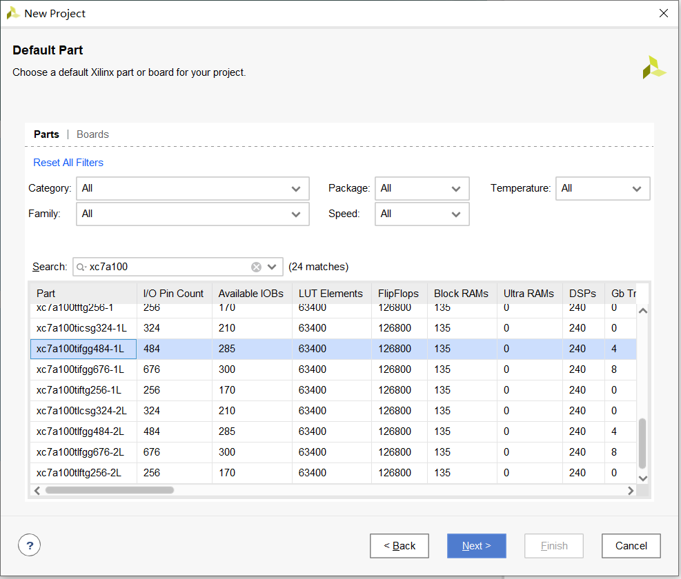 单击 Next 按,出现 Select Device 对话框,如图所示。需要选择设计所用的具体 FPGA芯片的型号,根据板卡所用 FPGA 的器件系列、封装、速度等级以及温度级别来进行筛选,小编还没有对应的硬件板块,所以先随便选了一款~