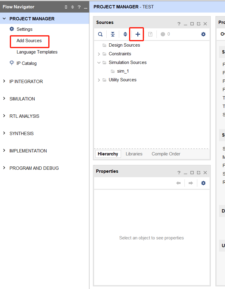 添加.V源文件,在 Flow Navigator 下,找到 Project Manager 并展开,单击 Project Manager 下的 AddSources 选项;或者在 Sources 面板下单击+按钮。1) Add or Create Constraints(添加或者创建约束);