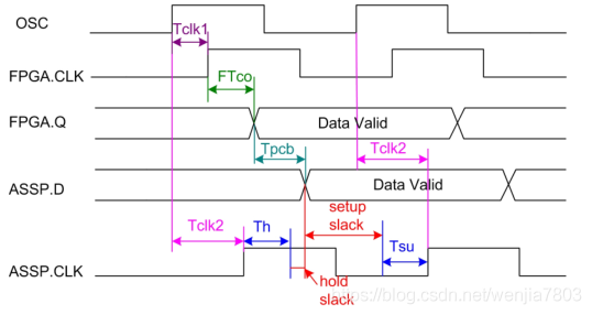 我们很容易就可以从公式(4)和(5),发现这两条公式与前面推导输入延迟如出一辙。只不过现在FPGA变成了输出器件,而Tsu、Th是下游器件的参数,综合工具并不知情,需要我们告诉他。除了FTco以外,其他参数都需要我们告诉工具。