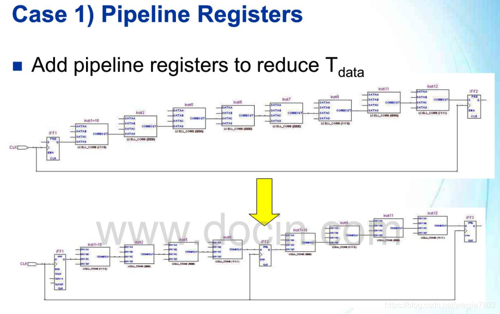 Logic level太大的处理方法就是重定时(Retiming)了,典型的重定时方法就是流水线,将过于冗长的组合逻辑增加寄存器进行打拍。